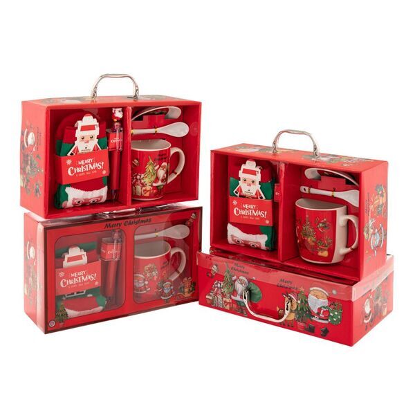 A festive gift set including a ceramic mug, spoon, saucer, pen and cozy socks, all beautifully packed in a red suitcase-shaped box.