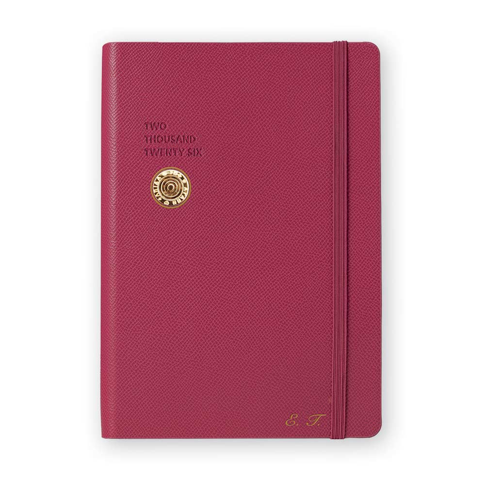 Handmade Daily Calendar 2026 by Type Center, with the ELPIDA Charm for 2026 in the form of a coin. It is made of high quality eco-leather and is available in 9 colors. It features a day-by-page display layout, includes a silk bookmark and colored doily in the same color and flexible binding.