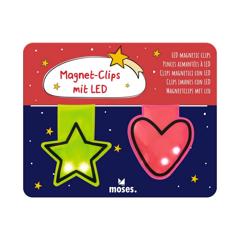 The Moses LED clips make kids more visible and safe in the dark, while adding fun with their bright colors and cheerful designs (stars, hearts, or Christmas trees). Each set includes 2 clips with strong magnets, easily attached to jackets, backpacks, or bags, featuring 3 lighting modes: steady, fast flash, or slow flash.