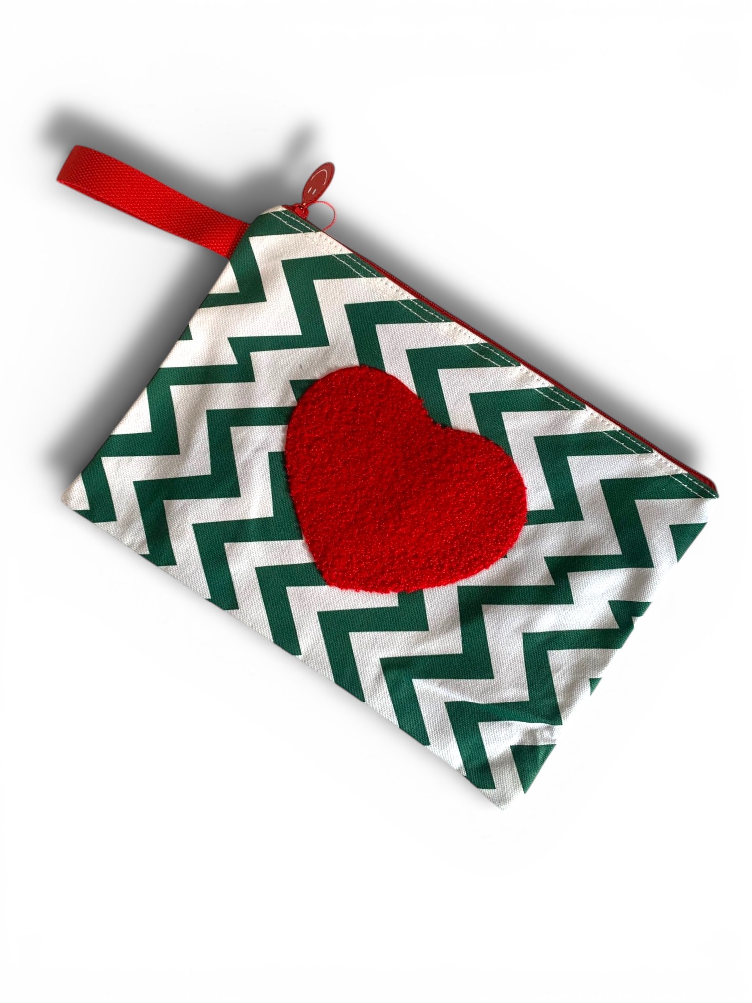 Fabric pouch that combines practicality with modern design. The unique patterns and the heart on the front make it stand out, perfect for organizing all essentials inside the bag!