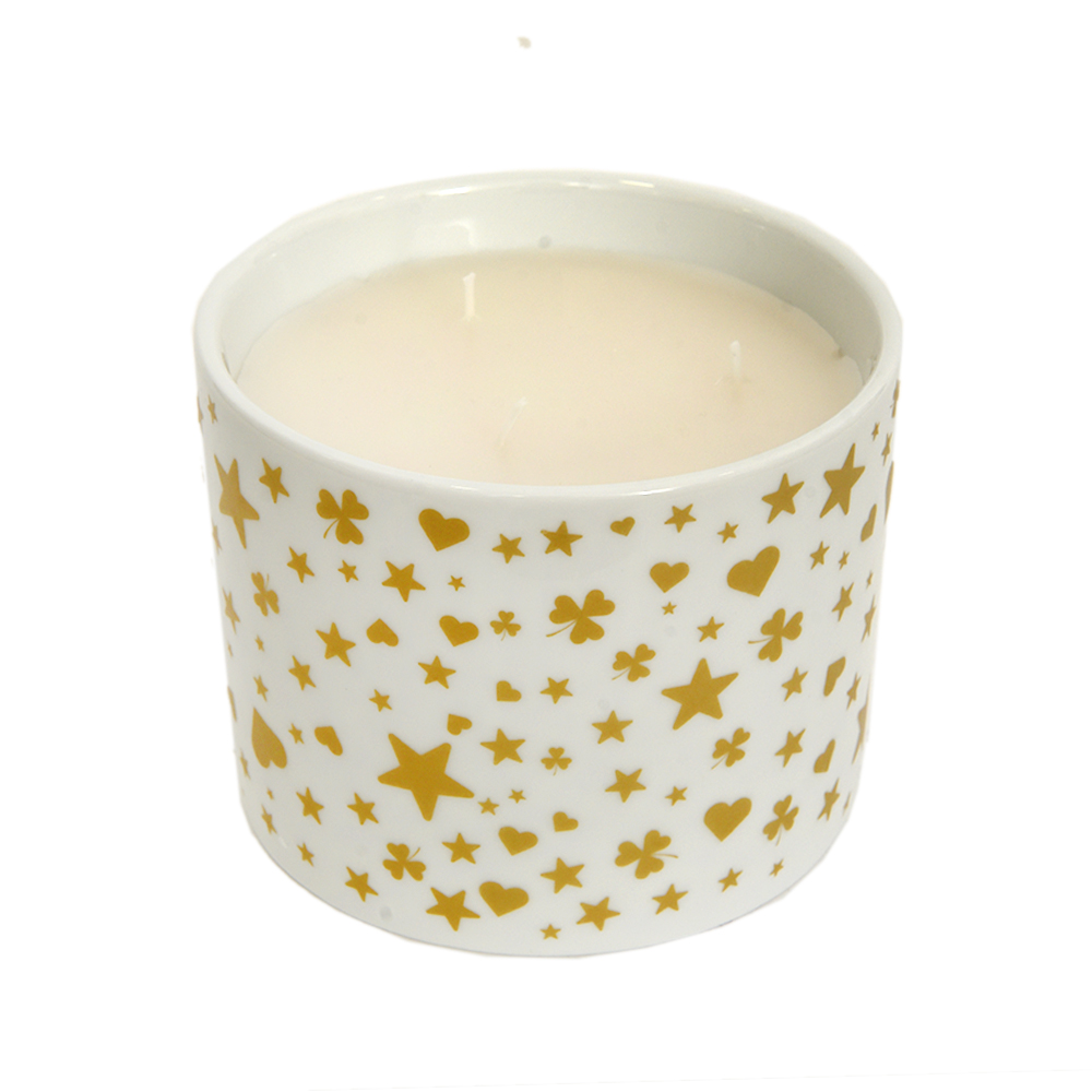Κομψό πορσελάνινο κερί σε λευκή απόχρωση, διακοσμημένο με χρυσά μοτίβα από αστέρια, καρδιές και τετράφυλλα τριφύλλια. Ο διαχρονικός του σχεδιασμός και οι χρυσές λεπτομέρειες προσδίδουν αίσθηση πολυτέλειας, καθιστώντας το ιδανικό τόσο ως διακοσμητικό στοιχείο όσο και για τη δημιουργία ζεστής, ατμοσφαιρικής φωτεινότητας στον χώρο.