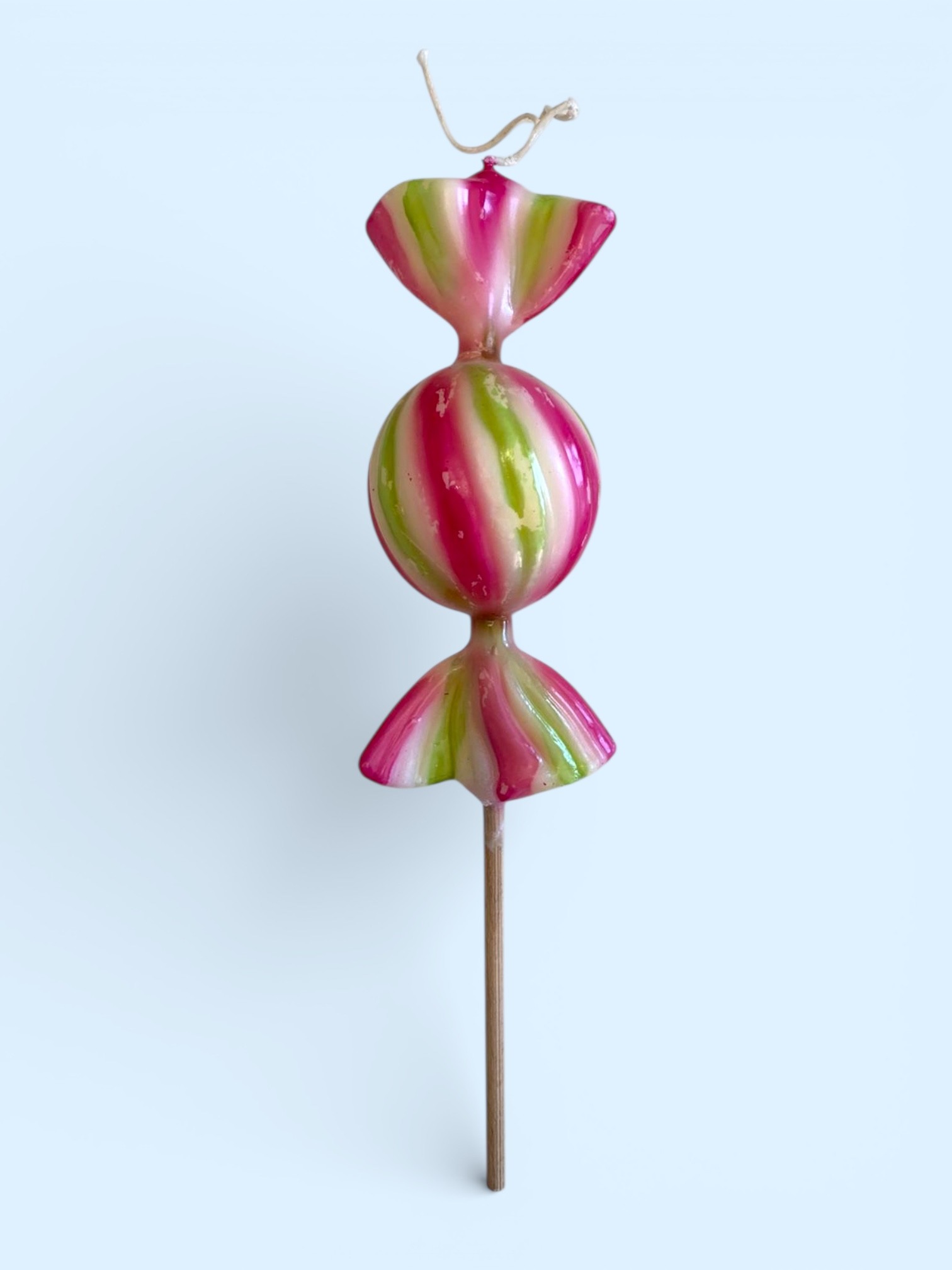 Λαμπάδα σε σχήμα στρογγυλής καραμέλας, γλυκιά, χαρούμενη και γεμάτη χρώμα, διατίθεται σε τρεις αποχρώσεις: μπλε, φούξια, φούξια/πράσινο.
